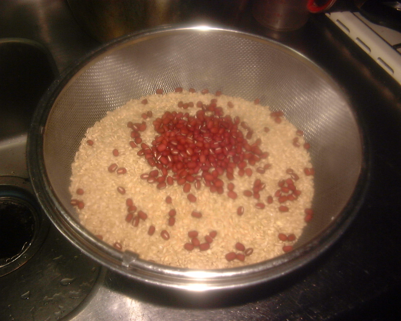 玄米に小豆、塩を入れて専用の圧力なべで一升分特別な炊き方をします。