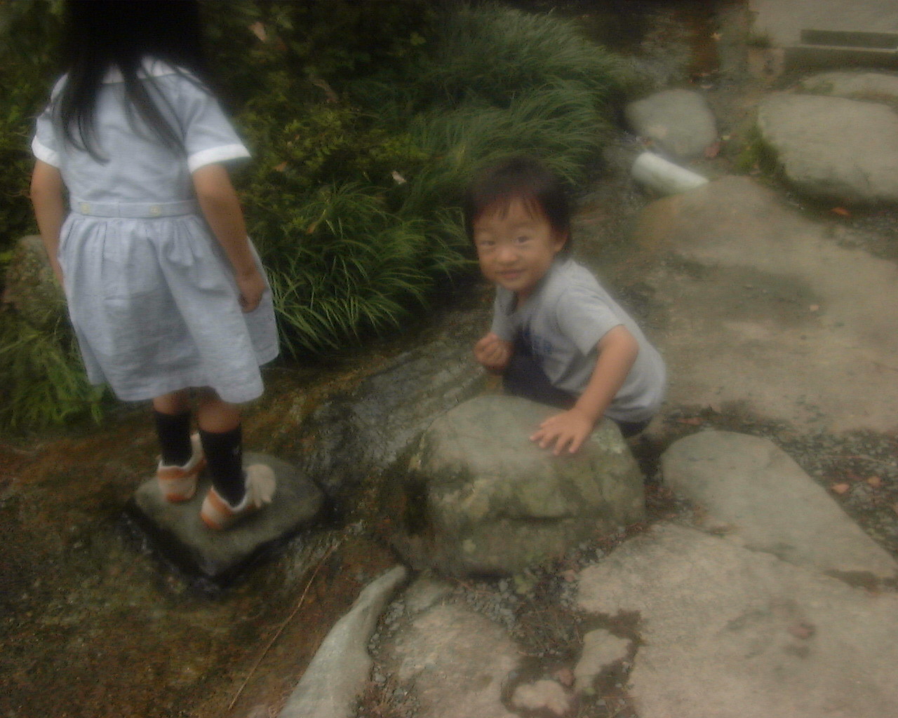 境内にあるお庭で川を渡ったり、走り回って遊ぶ子供達。