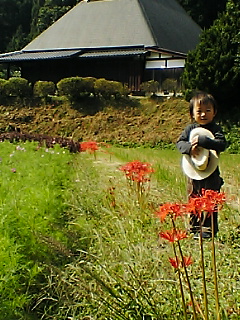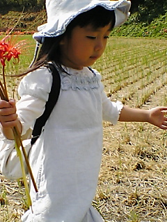ミオは「わーきれい!」と彼岸花を見て言い、倒れているのを見つけてそれを嬉しそうに摘み始めました。ミオが花束にして彼岸花を持っていると、なんだか私の中の彼岸花に対する悪いイメージの呪縛が解けたような感じがしました。感じたままに振舞うって素敵だな。いつも子供を見ていて思います。