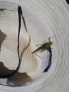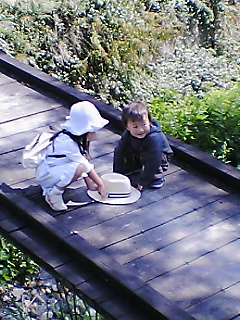 橋の上でばったを見つけます。ヒロ君の帽子でつかまえたー!