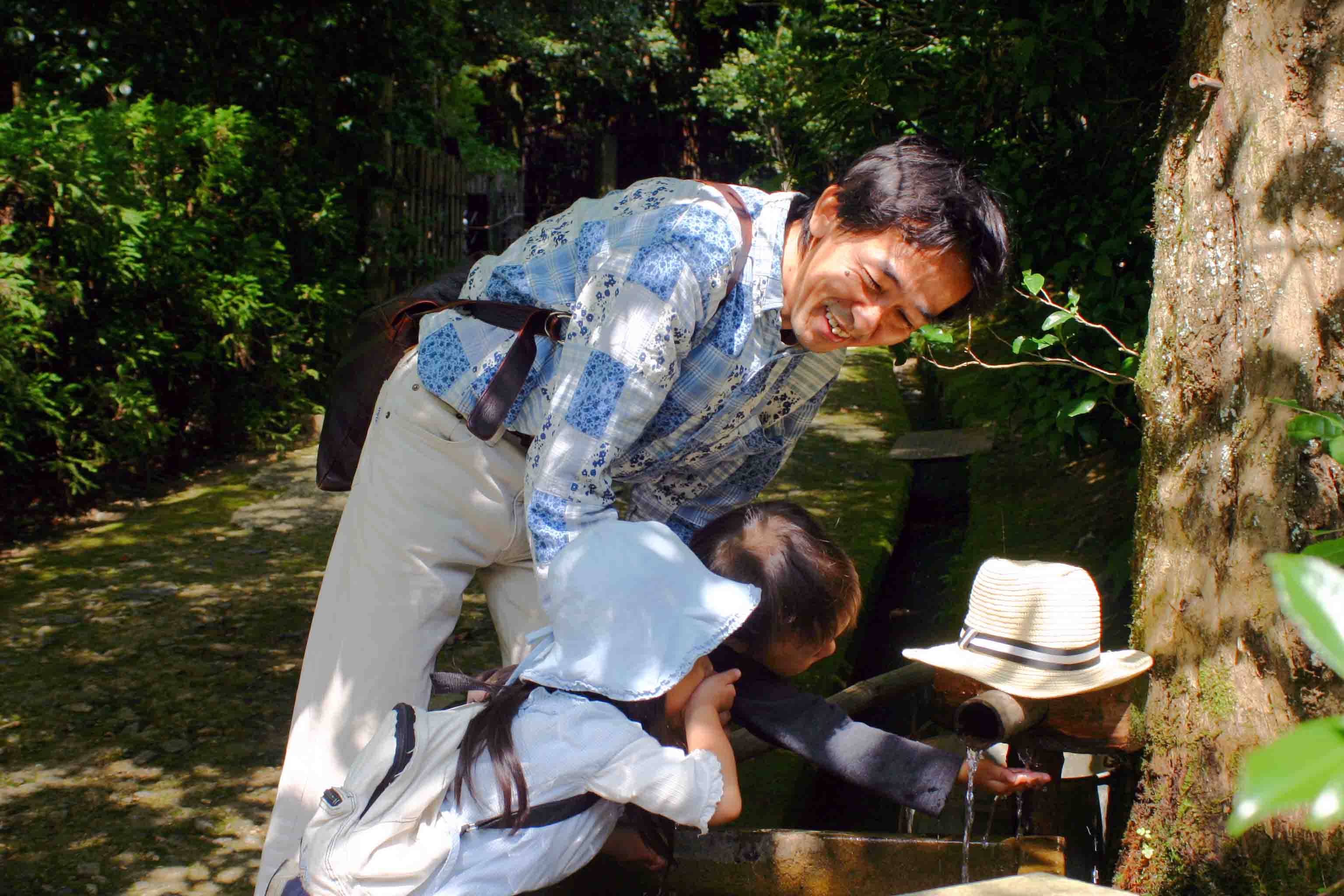 主人がサポートして、寂光院の脇にある湧き水をおいしそうに飲み続ける2人。特別おいしく感じるようです。