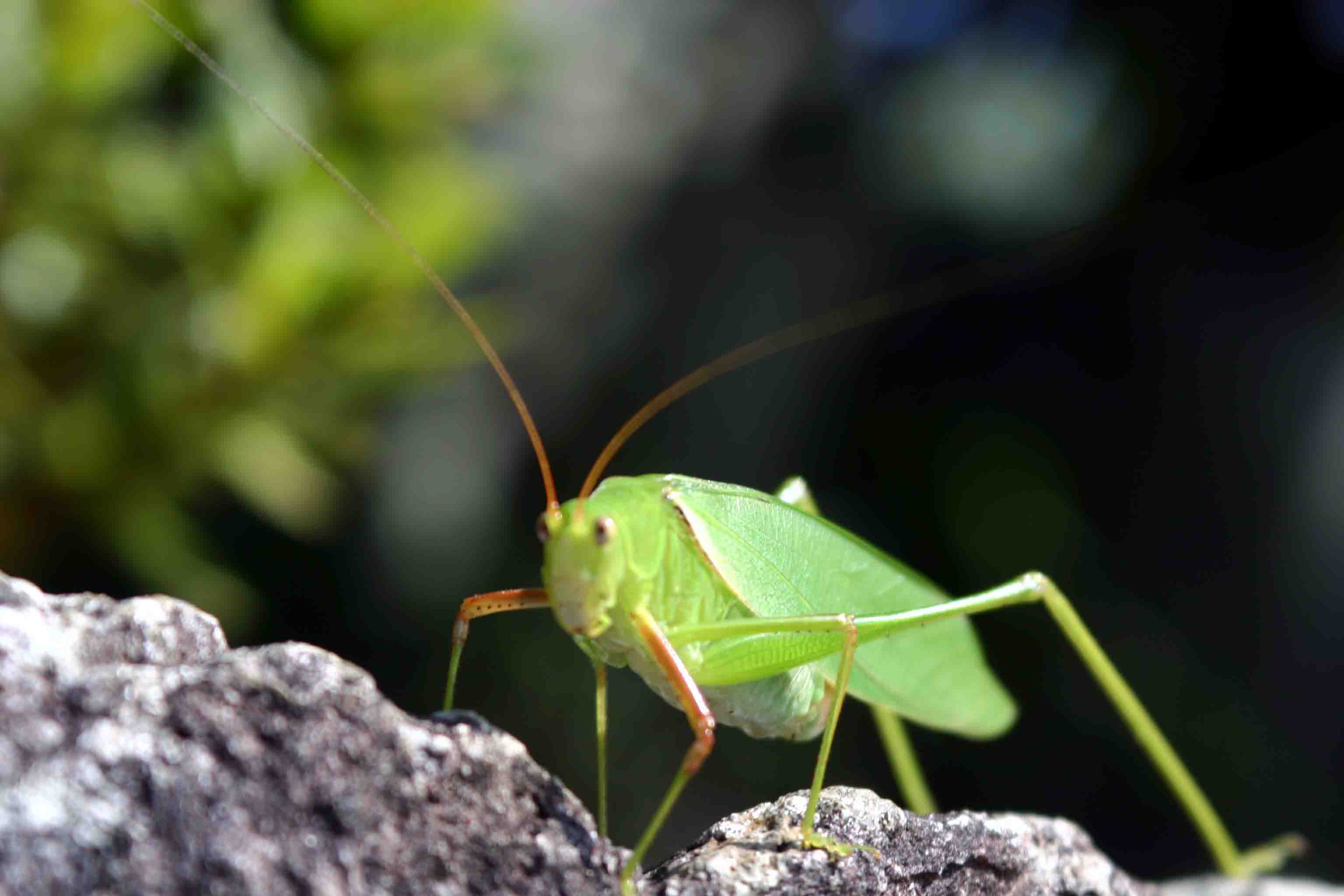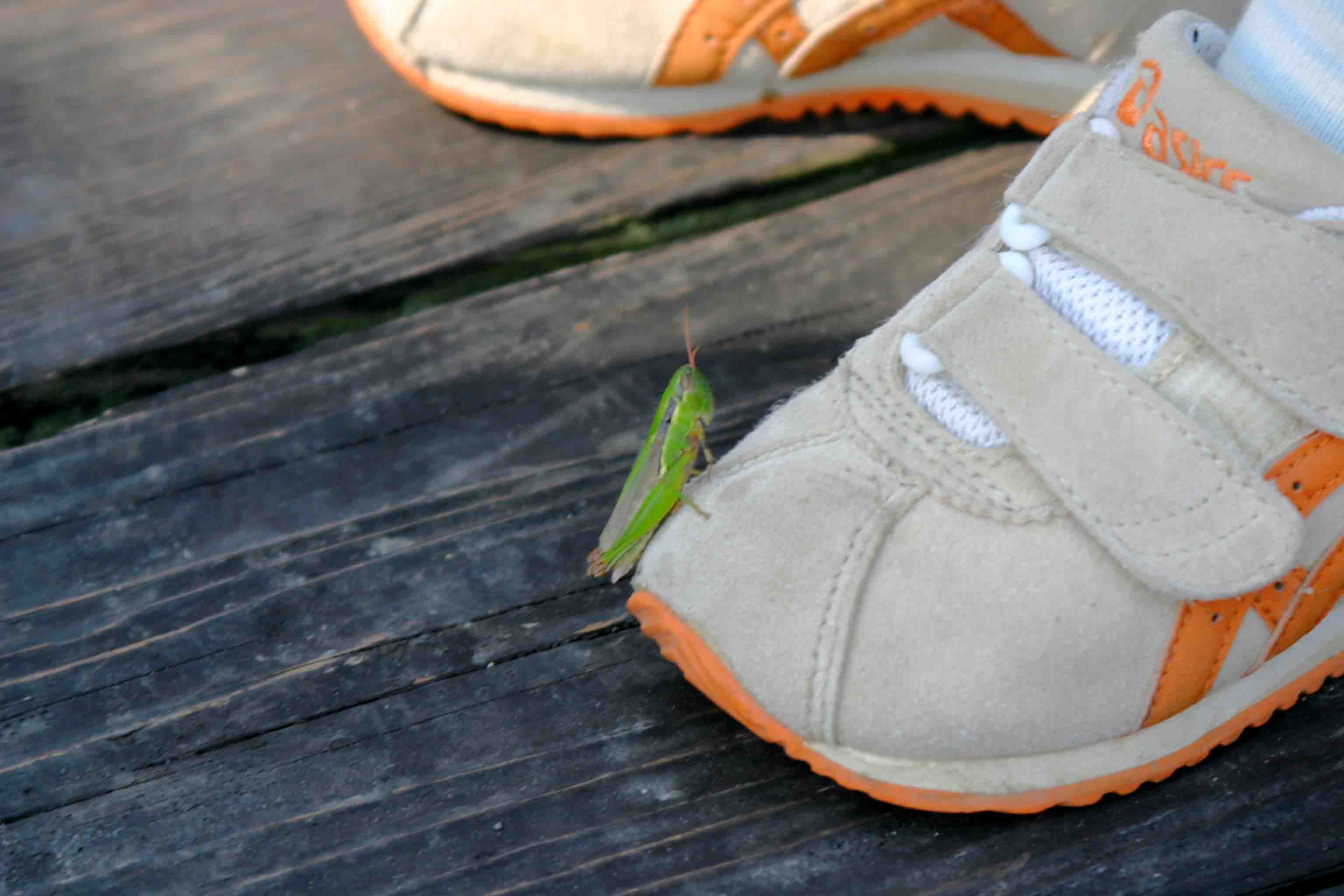 ミオの足に飛び移って「 ここ、とっても気に入ったよ!」と動かないばったさん。