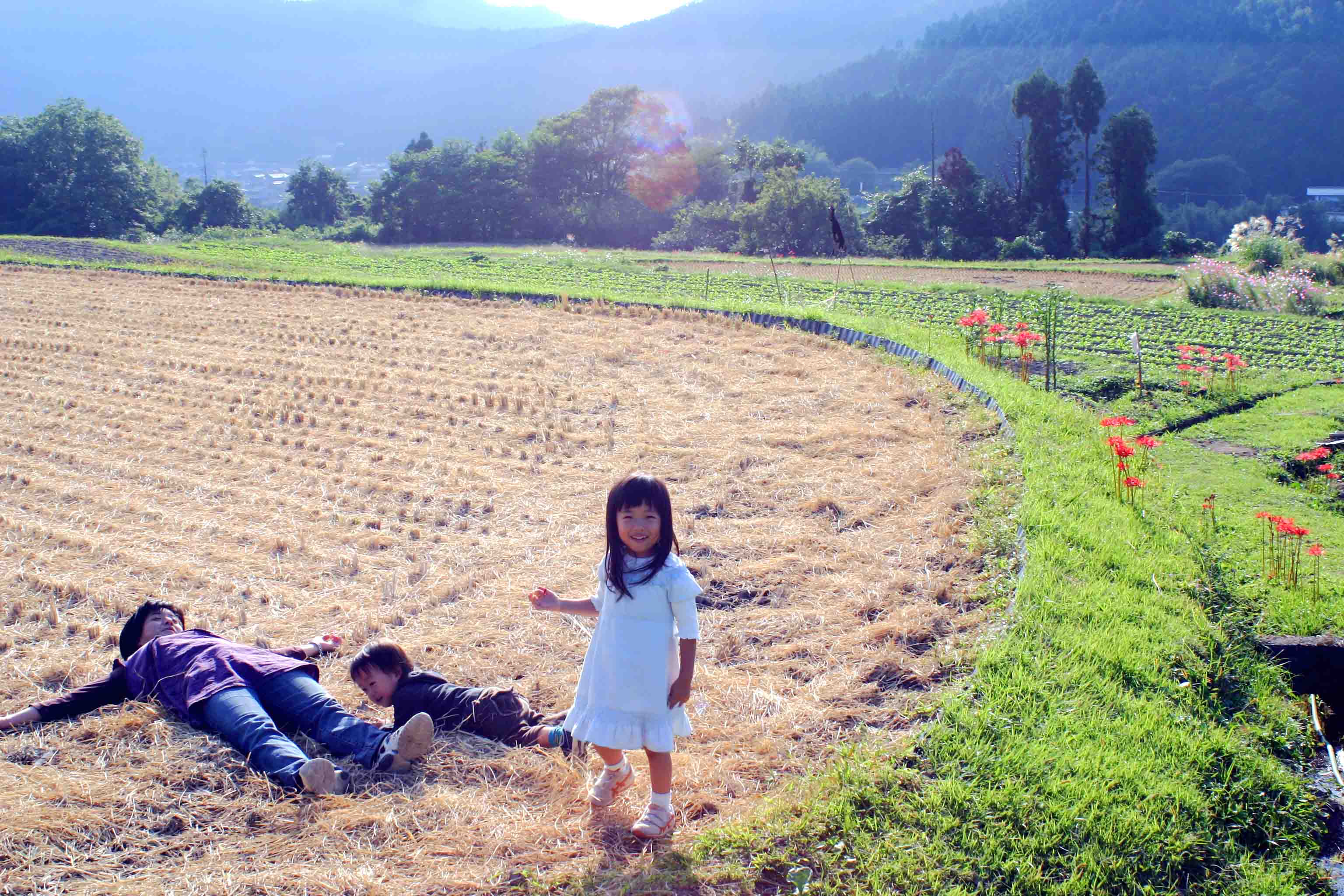 わらのにおい。土のにおい。青い空。田んぼで寝転ぶって気持ちいいねー。