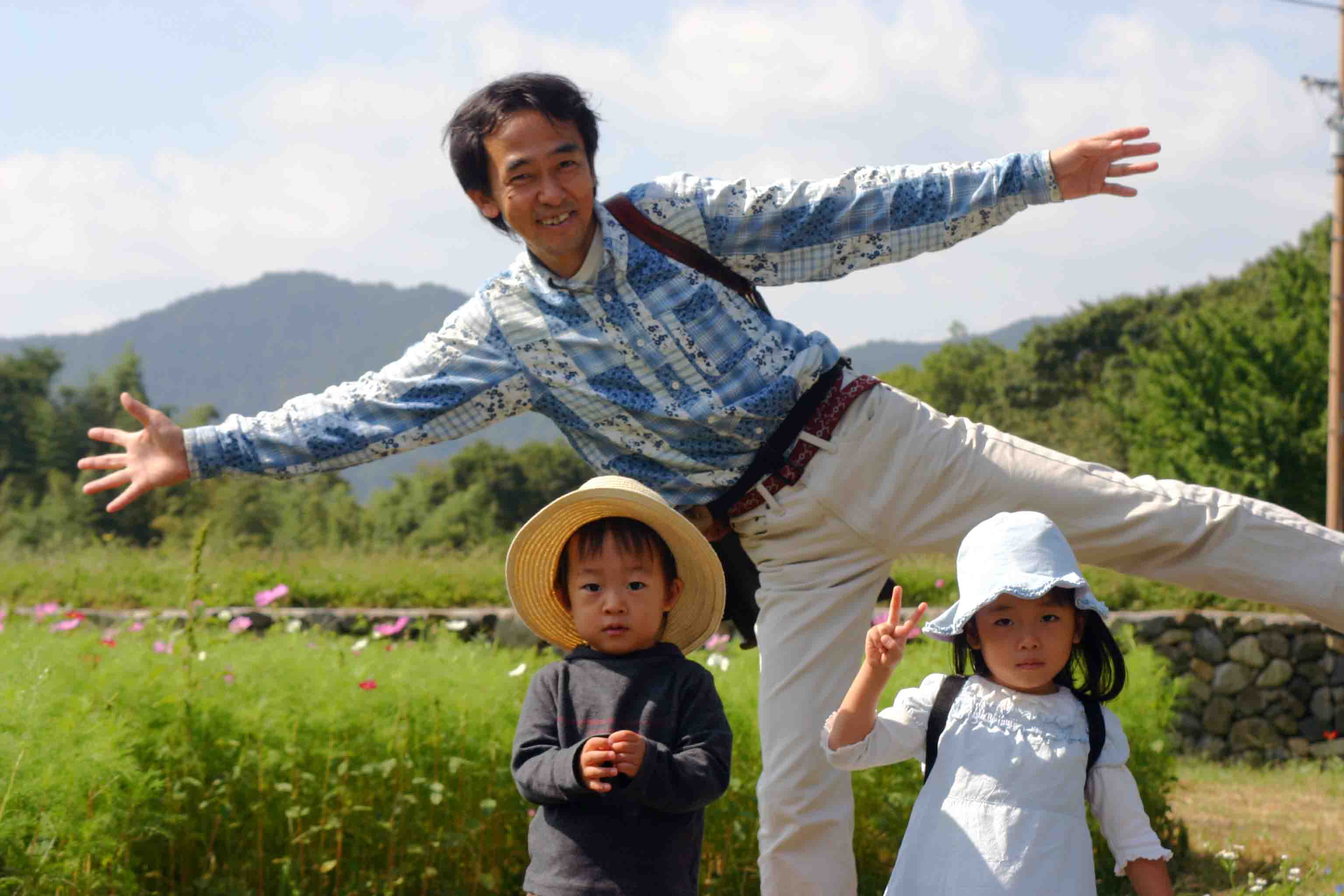 コスモス咲く大原の美しい景色を前に、子供のような笑顔のお父さんと子供たち