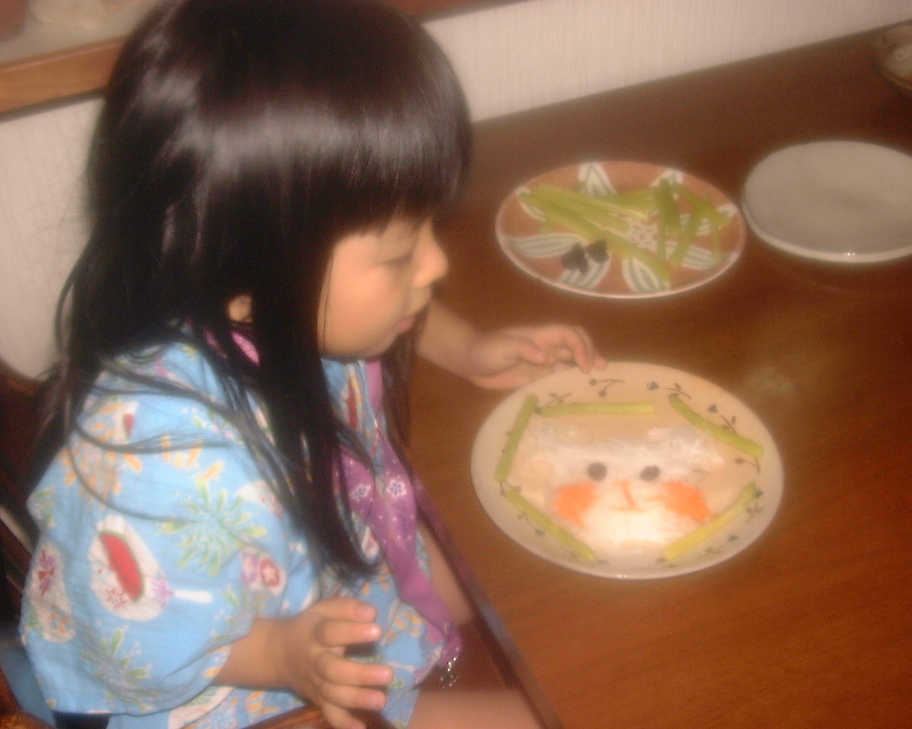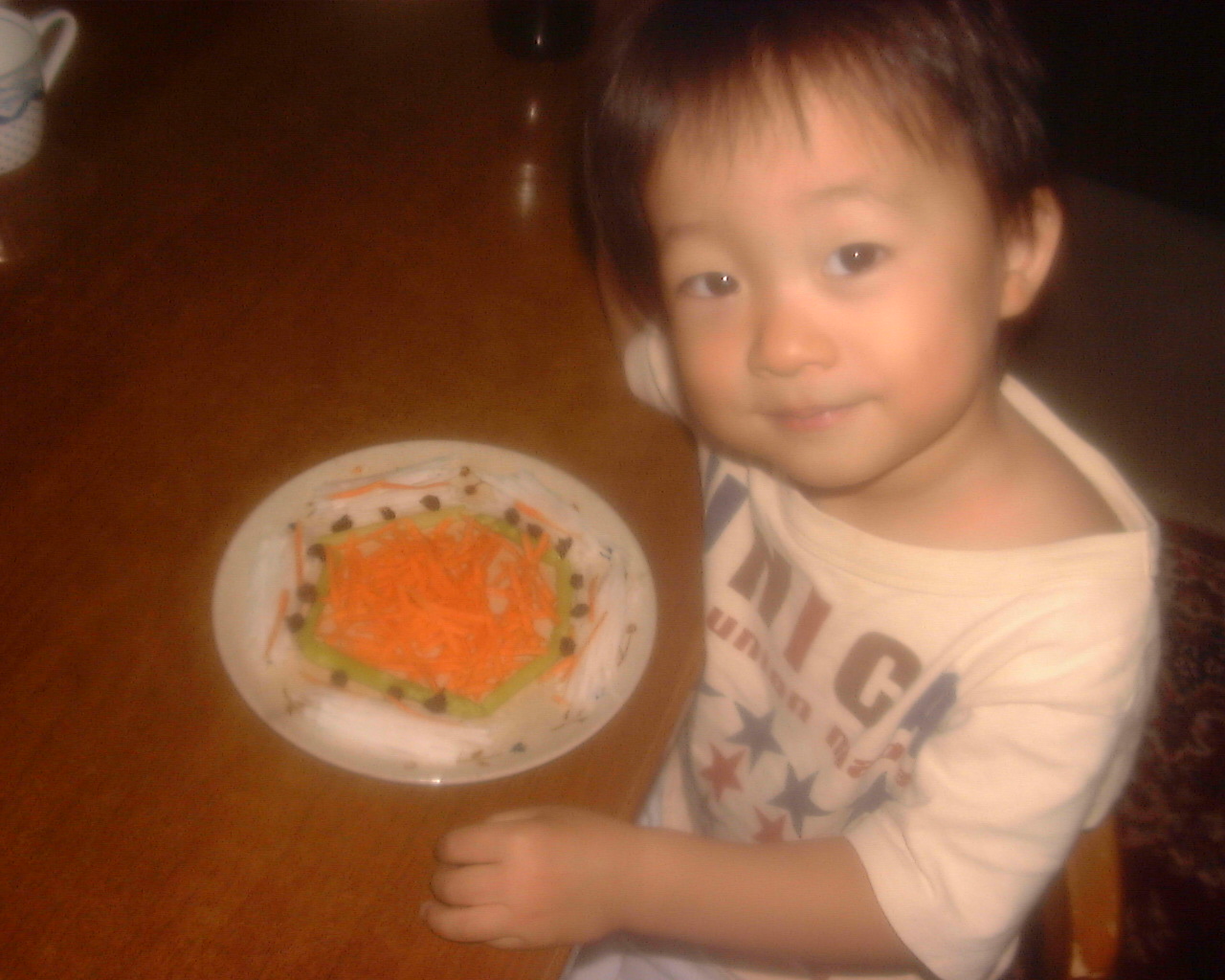 アスパラを線路に見立てて「大根とにんじんの新幹線サラダ」です。
