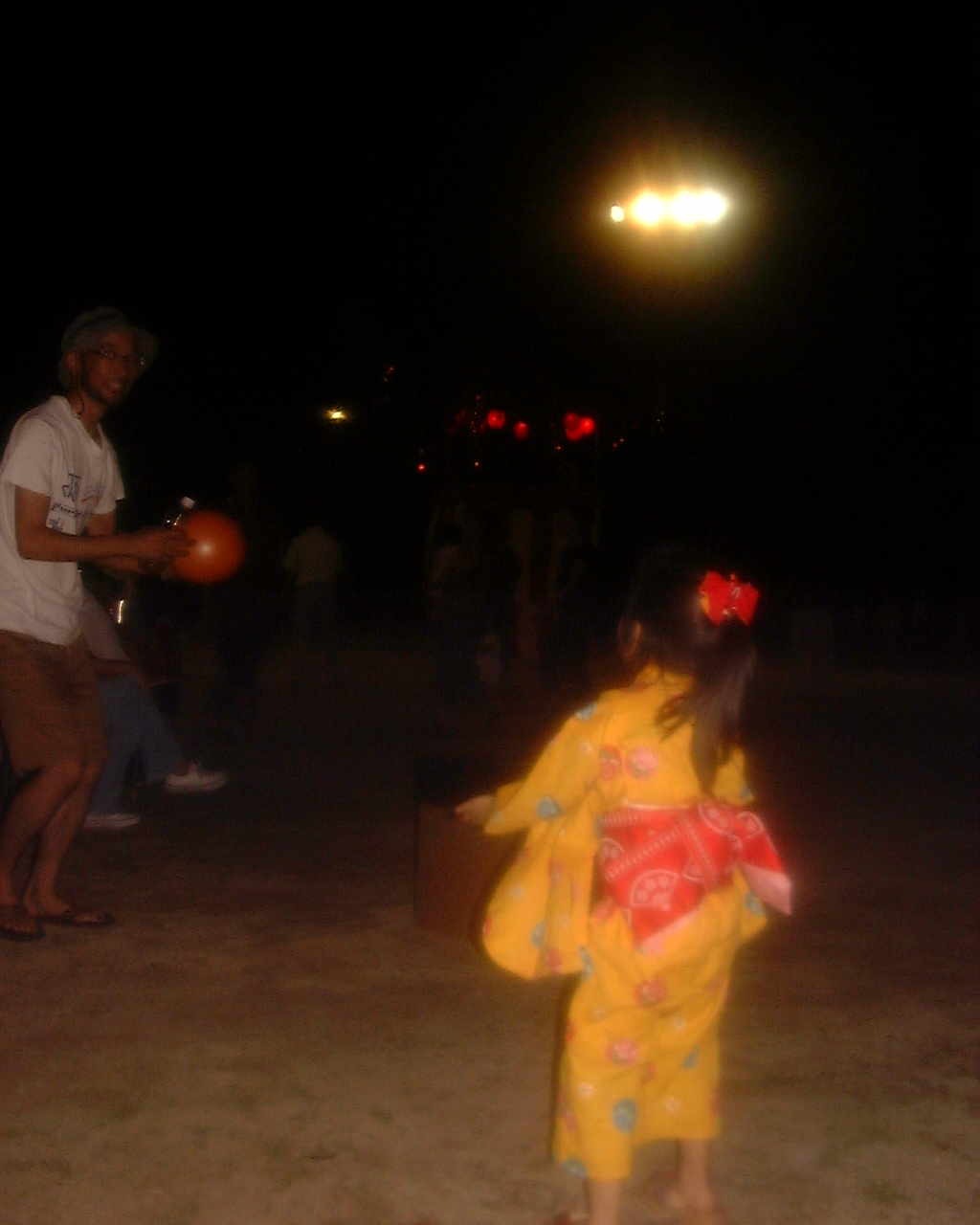 ミオが盆踊りを見たいいうので8時までお友達のなおちゃん家族と遊びながら待つ間、吹いてくる風が心地よく初秋を感じました。