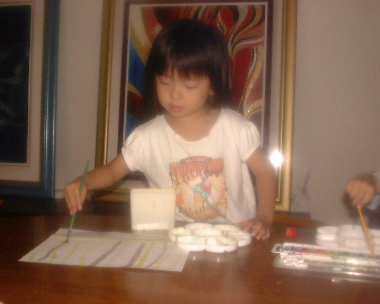 主人はお休みでまだゆっくり寝ていたので”まあいいか”と朝食前に絵の具を使ったお絵かきタイムが始まります。