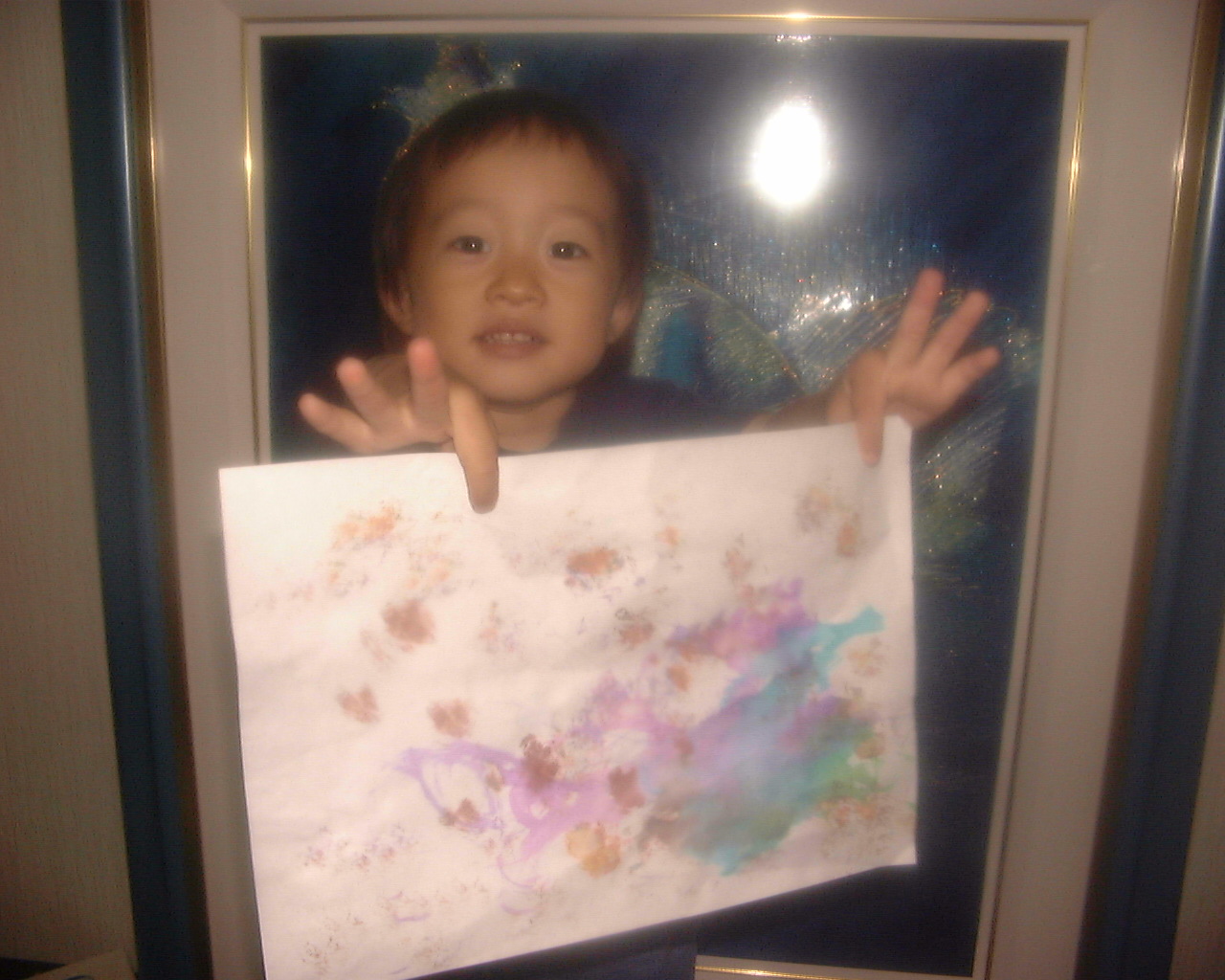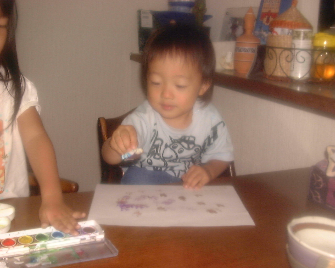 ヒロヒトは本当に楽しそうにティッシュに絵の具をつけてスタンプする色遊びを始めます。