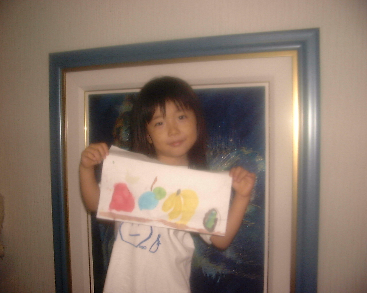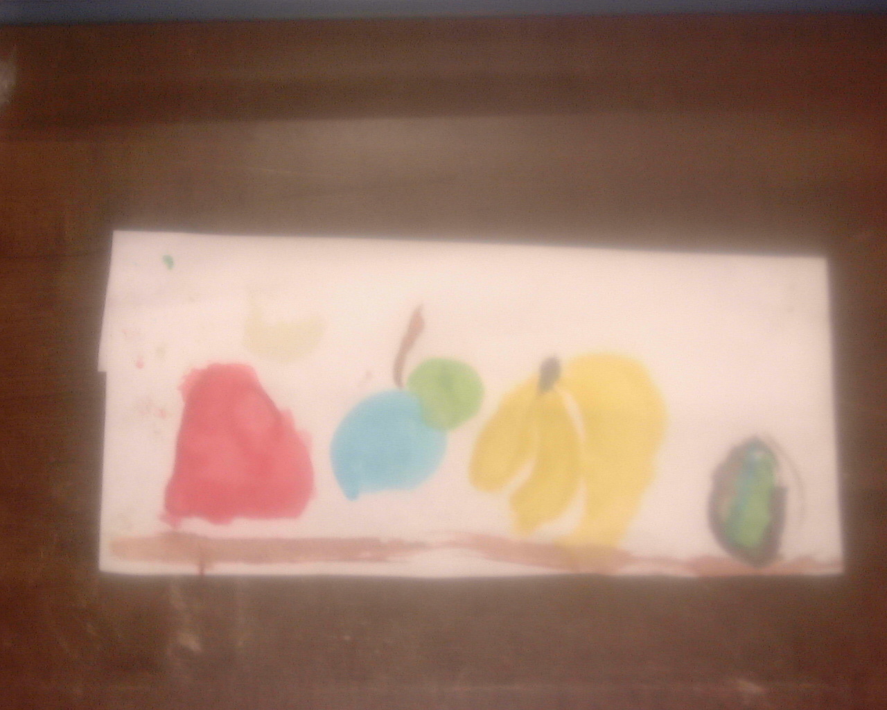 「いちごとブルーベリーとバナナとスイカでーす。」「赤ちゃんスイカやね。これからどんどん大きくなるのかな?」と言うと「赤ちゃんじやない。大きいよ。」と虫眼鏡をあててスイカを見せてくれました。「うわー。ほんとやね!おおきいスイカや。」