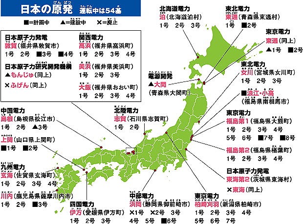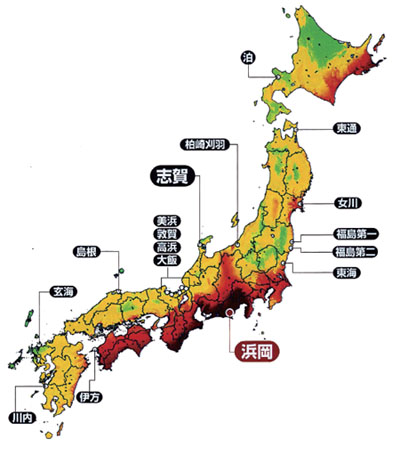 上記は現在の日本の原発立地図。浜岡原発が止まれば東海地震に対してはかなり安心できると思います。